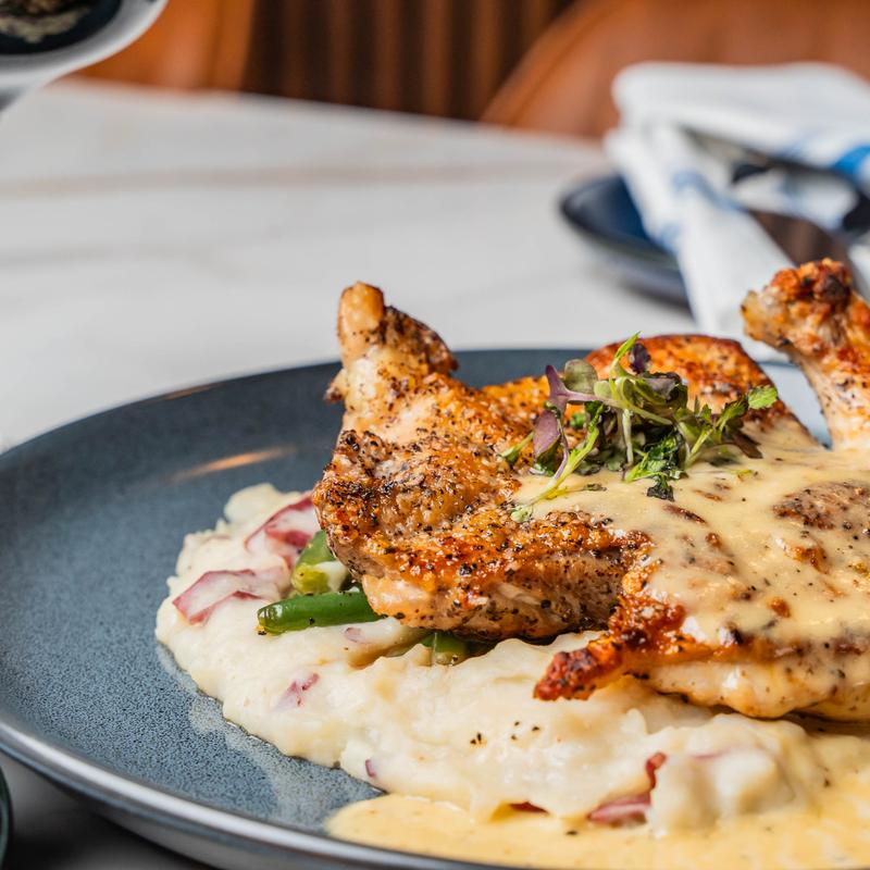 Bone-in, garlic mashed potatoes, haricots verts, and apple shallot chutney.