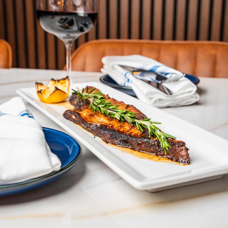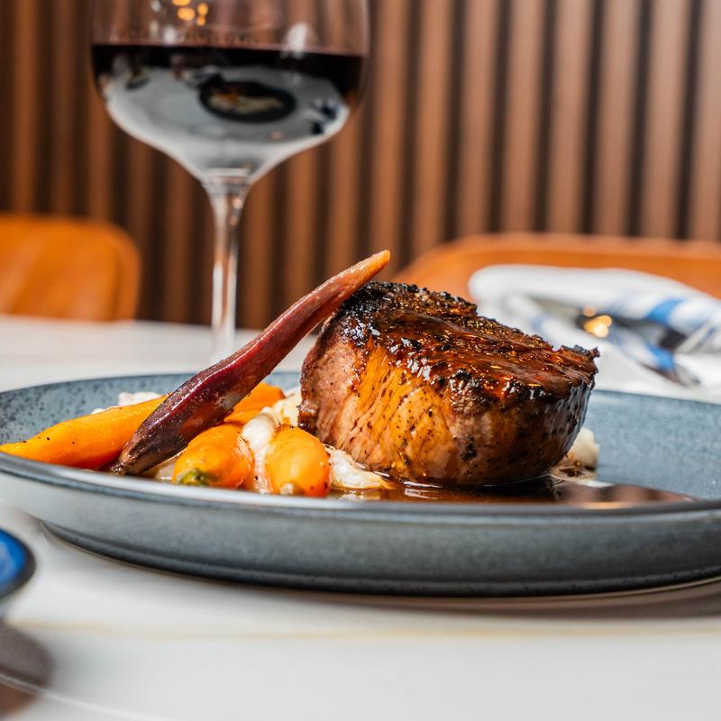 14 oz, heirloom carrot, red skin potato, and red wine demi-glace.