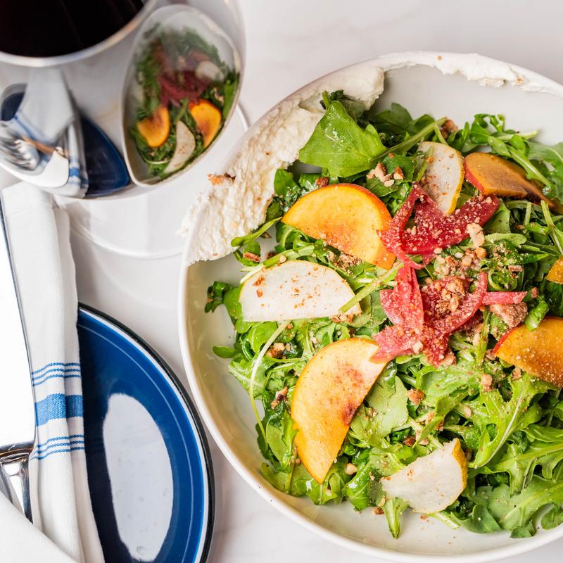 Arugula, spinach, heirloom tomato, toasted almonds, citrus vinaigrette, and balsamic glaze